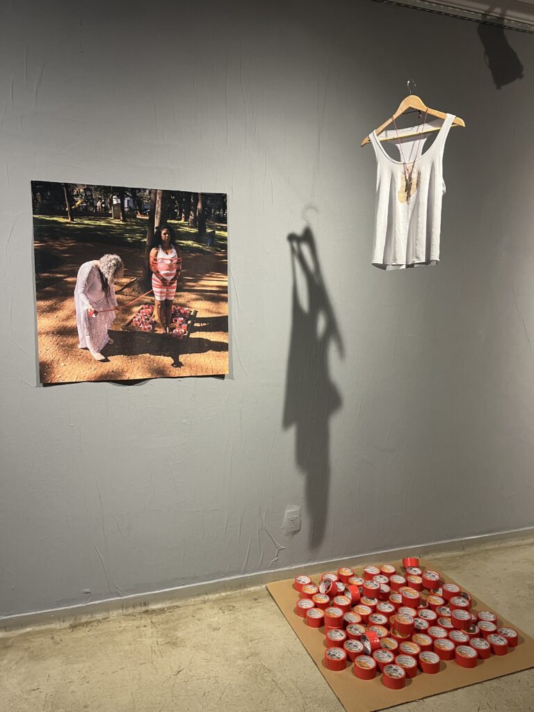 Por meio da ativação artística, a artista ressaltou a percepção dos conflitos, tensões e fissuras presentes nos atos de seleção, organização, exposição e celebração de memórias. Um traço comum em ambas é a escolha da artista em fazer uso das cores vermelho e dourado, para sublinhar, dialeticamente, de um lado dor, sofrimento, tristeza e opressão, e de outro, brilho, poder, alegria e iluminação ancestral.
