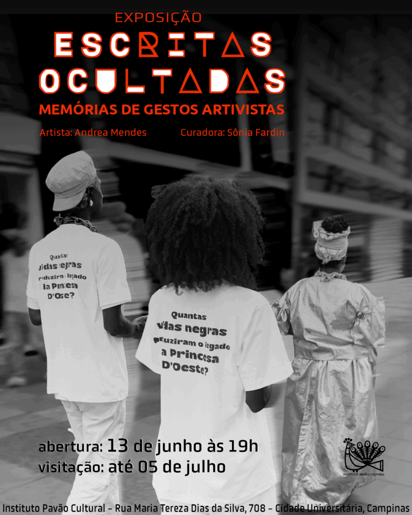 Ocupação escritas ocultadas – A paisagem que não Passa (2024) – intervenções: O legado da Princesa – Cortejo que questiona “quantas vidas produziram o legado da princesa?”, percorrendo ruas e monumentos que evidenciam as formas de ocultação dos saberes e conhecimentos negros, mas também destacam locais de resistência e afirmação da presença da matriz africana como produtora da riqueza que fez e continua a fazer o legado da “Princesa do Oeste”. Rua Treze de Maio, antiga rua São José, esquina com as escadarias da Catedral Metropolitana, cortejo termina no Monumento ao Bicentenário, celebrando a Princesa do Oeste e seu legado produzido por vidas negras.Realizado no dia 16 de julho de 2024. Embaixo do Chão – Largo em frente ao Fórum Municipal. Este espaço carrega a memória afetiva da ausência da Igreja do Rosário, símbolo da presença organizada das irmandades negras em Campinas. A igreja centenária e o cemitério que abrigava em seu solo foram apagados em 1956, eliminados da paisagem pela voracidade do capital imobiliário e seus planos imediatistas. .Realizado no dia 17 de julho de 2024. Tem preto no Museu – Área externa frontal ao Museu de Arte Contemporânea de Campinas e à Biblioteca Municipal Ernesto Manuel Zink. Arte Negra, coletivamente, se instala diante dos lugares oficialmente reconhecidos como centros do fazer artístico contemporâneo, para bradar sua presença potente na cidade, em contraposição à sua quase total ausência nas agendas dos museus e centros culturais. .Realizado no dia 19 de julho de 2024. Cortejo da Perseverança – O cortejo evoca a memória de Antônio Cesarino, Balbina Gomes da Graça, suas filhas, as Professoras Amância Ferreira Cesarino e Bernardina Gomes Cesarino, e seu bisneto Antônio Cesarino Junior. Casal Negro, Cesarino e Balbina, alfabetizados, fundaram a escola Perseverança em 10 de março de 1860. A escola funcionou até 1876 e foi uma das poucas instituições da época imperial dedicadas à alfabetização de negros. A memória desses educadores persiste em textos acadêmicos, mas onde mais podemos encontrar informações e referências sobre esta família de educadores negros na cidade? Realizado no dia 23 de julho de 2024. CorAção – Largo Santa Cruz (Largo da Forca) – Este local é marcado pela memória das punições, mutilações e mortes de escravizados ocorridas nos séculos XVIII e XIX, como o caso do jovem Elesbão, além da expulsão das comunidades negras que habitavam o antigo bairro Cambuí, resistindo aos processos de pauperização nos meados do século XX. A presença persistente da população em situação de rua, o apagamento cultural e o assassinato de vidas negras, principalmente jovens, são aspectos que compõem esta paisagem e que não diminuem, mas aumentam a cada hora. Realizado no dia 24 de julho de 2024. Dança da Alegria – Atual Praça Sylvia Simões Magro, onde se localizava o Campo da Alegria, como era conhecido no século XIX o então cemitério de escravizados. Mulheres negras artistas dançam, no dia da Mulher Negra Latina e Afro-caribenha, celebrando a vida e a resistência de seu povo. Realizado no dia 25 de julho de 2024 Ficha técnica: Artista: Andrea Mendes. Curadoria: Sônia Fardin. Artistas Convidados: Bruno dos Santos, Maraisa Rosa Sales, Raquel, Alessandro Oliveira, Rosa Sales, Thayara Magalhães, Joyce Nascimento, Ewerton Rodrigues, Poli Sales, Helen Aguiar, Thais Selva, Cecília Stelini, Ana Bia, Graciele Savio e Poli Sales. Produção e Mídias Sociais: Thiago Moreira e Letícia Rosa. Assessoria de Imprensa: Malu Borin. Fotografia: Fabiana Ribeiro. Filmagem: Carlos Tavares. Designer Gráfico: Thiago Moreira.