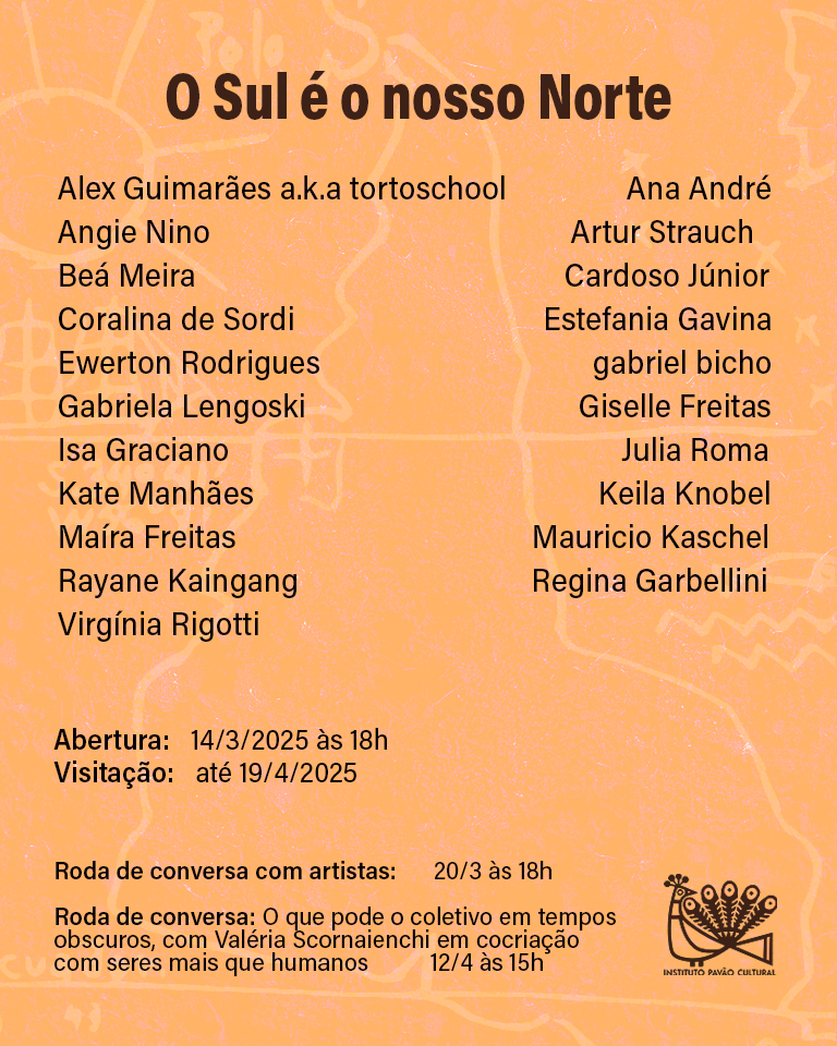 O Instituto Pavão Cultural inaugura no dia 14 de março a exposição coletiva “O Sul é o Nosso Norte”, reunindo obras de artistas de diversos lugares do Brasil e da América Latina, selecionados a partir de chamada aberta, que exploram as identidades sul americanas e as relações entre o Norte e o Sul Global. A abertura contou com a performance “Na hora do almoço”, de Maíra Freitas.